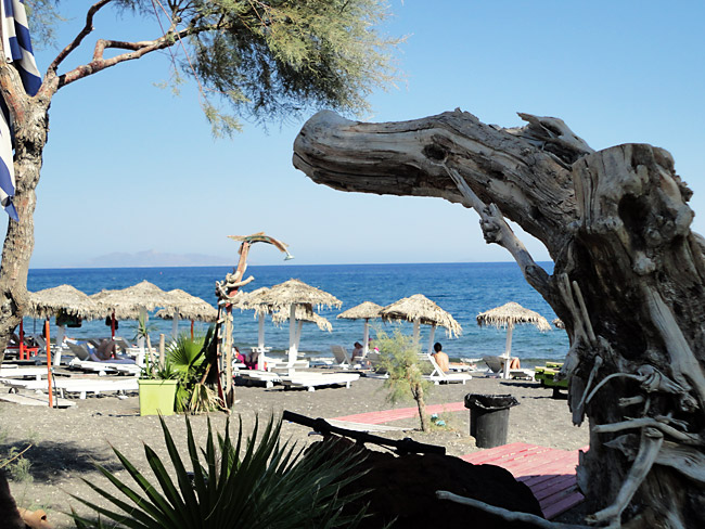 Hotel Veggera overlooks the Perissa beach and our room on the top floor has the best view right in the center, with the balcony facing the swimming pool and then the Aegean Sea. The traditional architecture of Santorini is cubical houses, made of local stone & whitewashed or lime-washed with various volcanic ashes used as colors usually blue. Some do deviate but domes and arches seems to be a must, thus giving the entire island a constant look and keeps intact the beauty of the traditional houses (perivolas). Our hotel sticks to the same architecture.